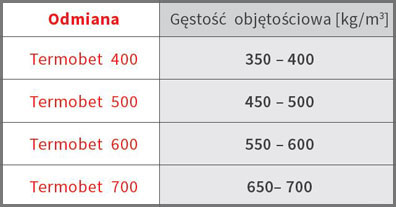 Beton komórkowy Termobet produkowany w kilku odmianach gęstości od 400 do 700 kg/m3 może być stosowany do wznoszenia ścian wielowarstwowych. Im gęstość objętościowa jest mniejsza, tym lepsze parametry termoizolacyjnej bloczków. Najlżejsza i najcieplejsza odmiana Termobet 400 przy bloczku grubości 42 cm zapewnia doskonałą izolacyjność cieplną ściany na poziomie U = 0,22 W/m2K . Elementy murowe z betonu komórkowego Termobet produkowane są zgodnie z normą PN-EN-771-4.