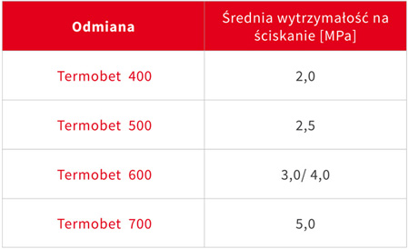 Wytrzymałość bloczków betonu komórkowego Termobet® w zależności od odmiany, pozwala na wznoszenie ścian budynków jednokondygnacyjnych jak i kilkukondygnacyjnych. Bloczki Termobet® są odporna na czynniki zewnętrzne, zarówno wysoką, jak i niską temperaturę, nawet przybardzo wysokiej wilgotności.